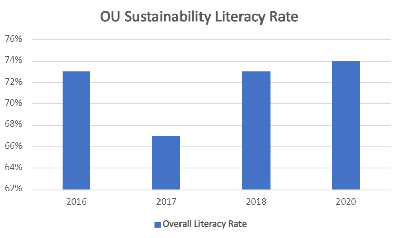 Goal 2: Assess and strengthen sustainability culture and literacy by evaluating performance on a literacy survey or test. In FY17, sustainability literacy was defined as being able to correctly answer 6 simple questions about the climate. For FY26, the target will be using a more rigorous literacy test. In FY17, 73% of campus community answered all 6 questions correctly. The goal for FY26 is to have 60% of campus community answer all 6 questions correctly on a more rigorous test.