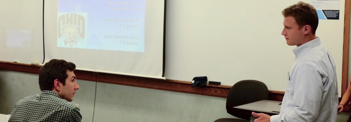 Alum Jacob Robertson, right, presents to Actuarial Science majors during an information session in Copeland Hall in fall 2016. Seated on the left is Abe Kassem, a junior Actuarial Science major.