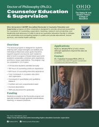 Doctoral study in Counselor Education and Supervision (CES) at Ohio University is designed to provide advanced preparation for counselors in the areas of counseling, supervision, teaching, research and scholarship, and leadership and advocacy. Graduates of the program serve as counselor education faculty in colleges and universities and counseling leaders in public and private educational, human services, and mental health settings. The first Ph.D. degree from the Ohio University Counselor Education program was granted in 1962 and the CES program was one of the first accredited by the Council for Accreditation of Counseling & Related Educational Programs (CACREP) in 1986. The CES program is CACREP Accredited, Reaffirmation in Process.