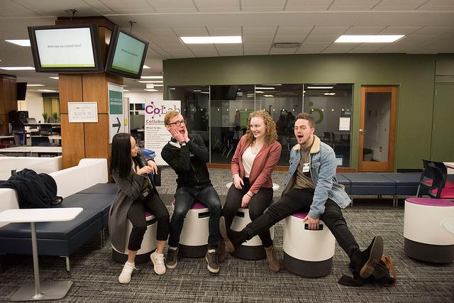 Students (L-R): Heidi Ha, Jake Morgan, Reilly Zink and Cody Pomeroy pose for a picture at the Co-Lab social reception after working all day at the Business of Games Summit on Friday, Feb. 22, 2019. The Co-Lab, which is located on the third floor of Alden Library, is a central hub that unites students from all backgrounds and embeds innovation and entrepreneurship into their lives.
