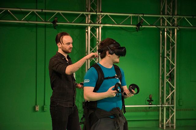 OHIO student Will Gray (left) sets up student Peter Vertin (right) to play his virtual reality game titled, "Atlas," in the GRID Lab open house during the Business of Games Summit on Friday, Feb. 22, 2019. Gray said he spent about four months designing the game.
