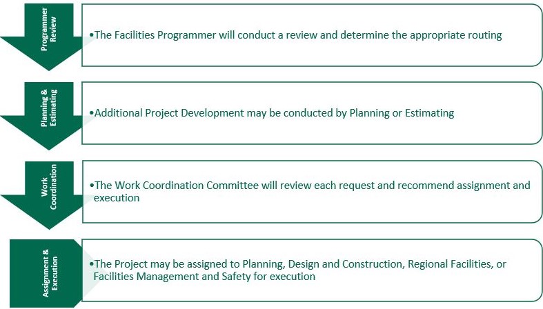 • The Work Coordination Committee formally approves the PIF, which includes representative from University Planning, Real Estate, Design and Construction, and Facilities Management and Safety. This committee will communicate once a week to discuss PIFs and one of the included departments will be assigned to the PIF. If Work Coordination does not approve the PIF, the submitter will receive an email communicating why the PIF was not approved. A representative of the assigned department will be in contact with the PIF submitter regarding the steps needed to proceed with project development within two weeks of the PIF submission.