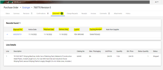 - Shipments tab: Grainger purchase orders will display a “shipments” tab updated with shipping notification information including date shipped, estimated delivery date, shipping carrier, and tracking number. This information will be dynamically updated as delivery information changes.