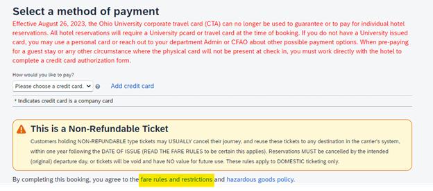 When you book your ticket in Concur, once you are on the “Select a method of payment” screen it will alert you that you are trying to book a non-refundable ticket if you have selected Basic Economy airfare. You can click in the highlighted area (as shown below) to read the restrictions associated with your airfare.