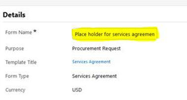 The Services Agreement Form now contains a new field called Form Name. In the Form Name field, users will replace the Services Agreement default with a brief summary description of the service. The brief summary of services should include the nature of service and any other pertinent details. This information will print on the PO for the supplier to see. The field is limited to 100 characters including spaces. Please refer to the updated Services Agreement quick reference guide for questions.