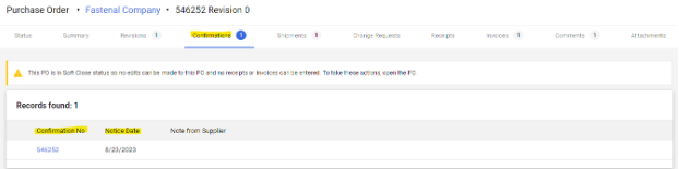 Confirmation tab: Fastenal purchase orders will display a “confirmation” tab that includes an estimated shipping date. The shipping date in the confirmation tab is static once the order is placed.