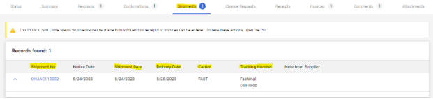 - Shipments tab: Fastenal purchase orders will display a “shipments” tab which will be updated with shipping notification information including date shipped, estimated delivery date, shipping carrier, and tracking number. This information will be dynamically updated as delivery information changes.