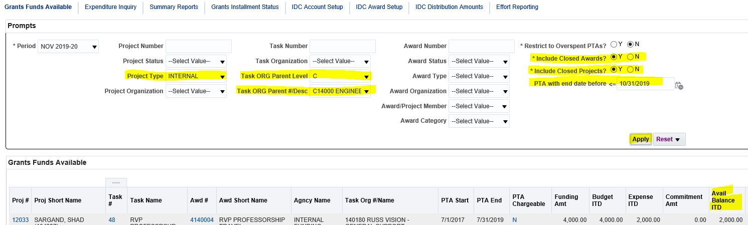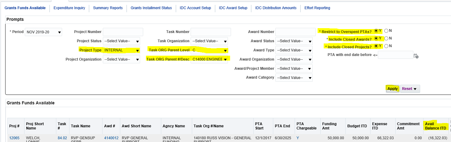- Internal award accounts attached to projects that have passed the end date should not have an available balance