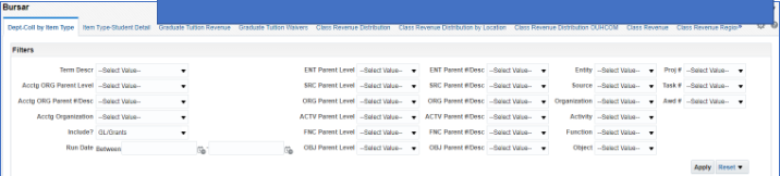 Dept-Coll by Item Type Report: This report will provide transaction detail by Item Type Line Description and Term. The Item Type is the charge/payment/financial aid that posted to a student account. Search parameter options: