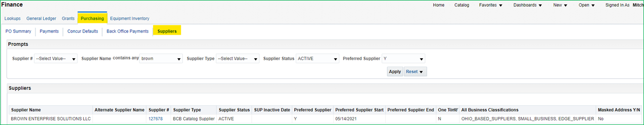 This dashboard will give campus users access to see all suppliers that are in the University’s financial system (both active and inactive). The page can also be used to: