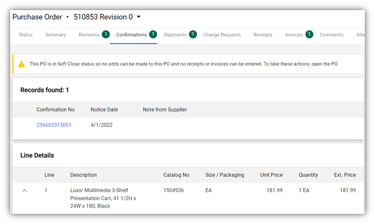 - Confirmation tab: ODP purchase orders will display a confirmation tab and indicate if any items are back-ordered, along with an anticipated shipping date. The shipping date in the confirmation tab is static as of the moment the order is placed and is not updated afterward.