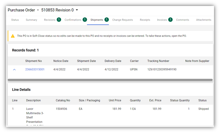- Shipments tab: this tab will be updated with shipping notification information including date shipped, anticipated delivery date, shipping carrier, and tracking number. This information will be dynamically updated as delivery information changes.