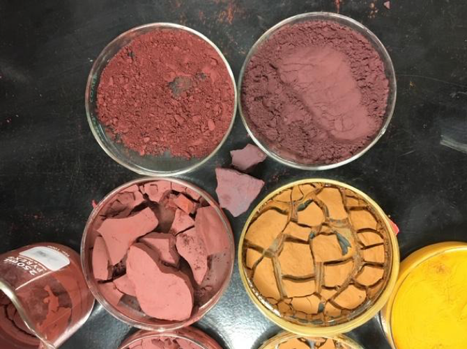 Guy Riefler, a civil engineering professor at Ohio University invented a process to collect the contaminated water, filter out the iron, and gift the clean water back to nature. Enter artist and professor John Sabraw, who recognized the potential for the colored waste. The two created teams of art and engineering students who worked on site and in the university’s labs to wash the filtered iron, dry it, and finally grind it into iron oxide pigments. They were joined by Michelle Shively, Sunday Creek Watershed Coordinator and Rural Action.
