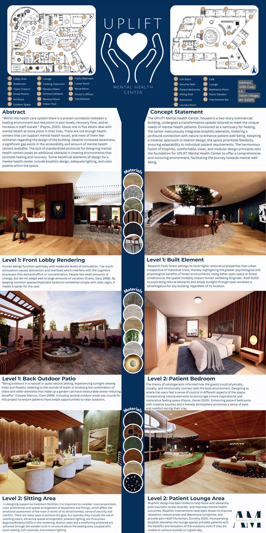 My thesis project is called UPLIFT, an impatient and outpatient mental healthcare facility. This subject is important to me because people who struggle with mental health should not only have access to great healthcare, therapy, and support, but also useful, inspiring, and beneficial design along their healing journey.