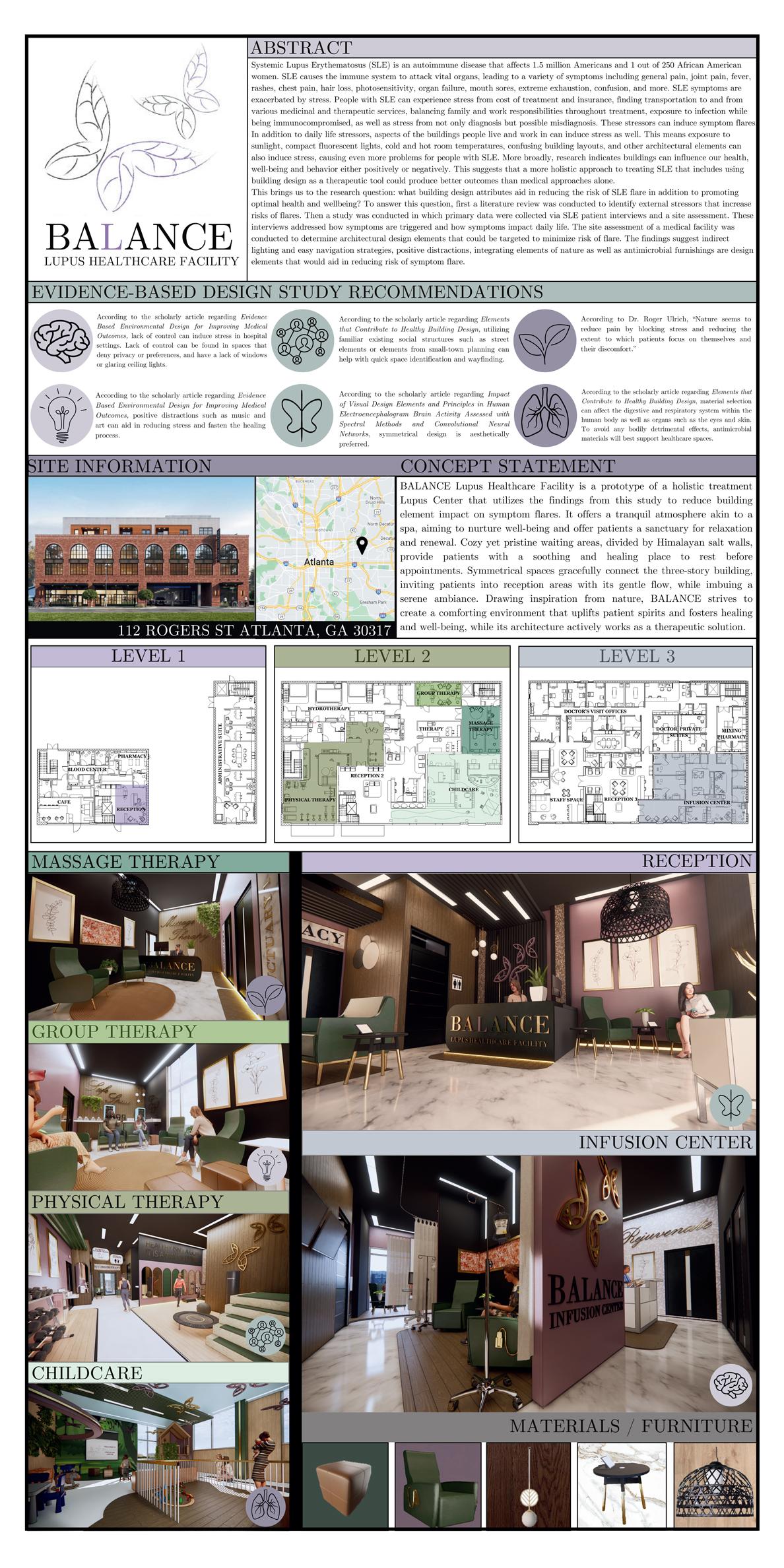 My thesis project is titled, "BALANCE: Lupus Healthcare Facility". This project aims to investigate and identify design solutions to address gaps in healthcare and enhance patient well-being, specifically for individuals with Systemic Lupus Erythematosus. The objective was to integrate the research findings into an existing building located in an area with a high population of people affected by Lupus. Individuals with Lupus experience diverse and challenging symptoms that can differ from one patient to another. Conducting this research is crucial to discovering evidence-based design methods that can support the treatment process and increase the well-being for those living with this autoimmune disease.