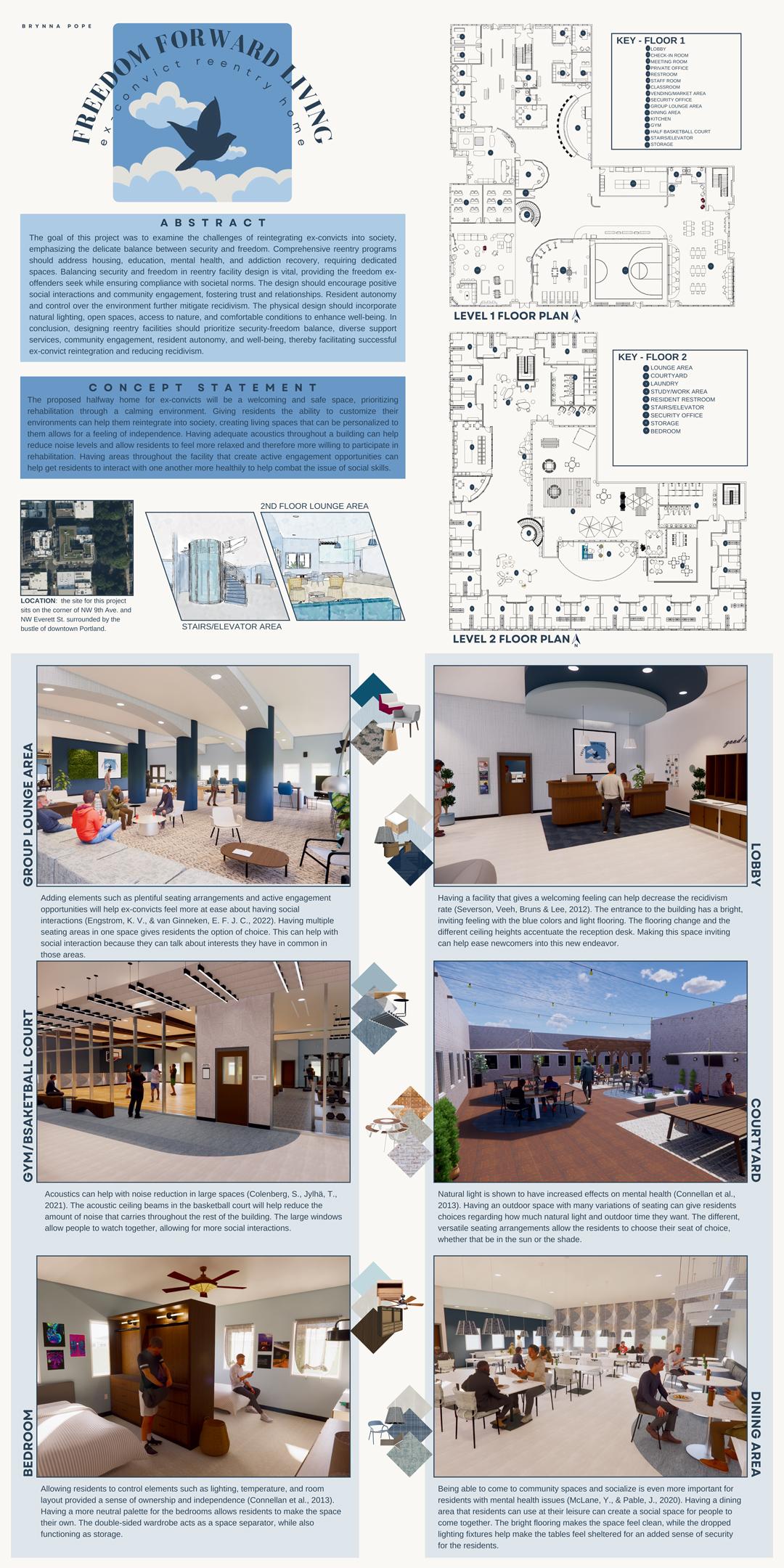 My thesis project is about creating a space for ex-convicts to re-enter society in a healthier way. Gaining independence after not having any for so long can have lasting effects. Creating a space that can help them get back on their feet before going out into the world again can help with the rate of recidivism, the tendency of a convicted criminal to re-offend, and make them better-functioning adults in society. This is an important topic to explore because there are many halfway home programs in the United States, but a lot of them are underfunded and don’t have the proper resources to help ex-convicts understand how to return normally to society. By giving more attention to the issue, hopefully, it will educate more people and encourage them to explore this topic in their own ways.