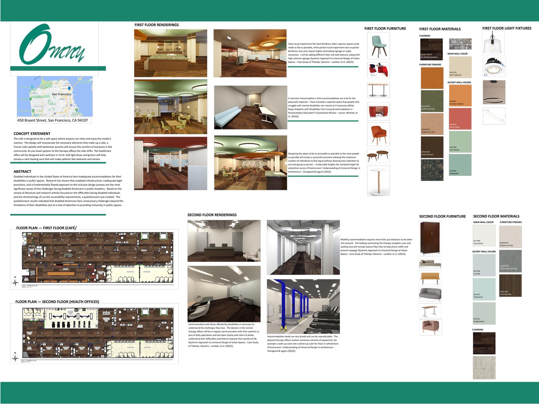 Omny's mission is to provide a public cafe and scheduled appointment therapy office designed to be universally accessible from the beginning instead of including accessibility as an afterthought. A common difficulty facing those with mental, physical, and sensory disabilities is the lack of inclusive design, or the obtrusiveness of poorly designed accessibility features. This facility hopes to provide nurturing drinks and inclusive care in an accessible, aesthetically pleasing environment.