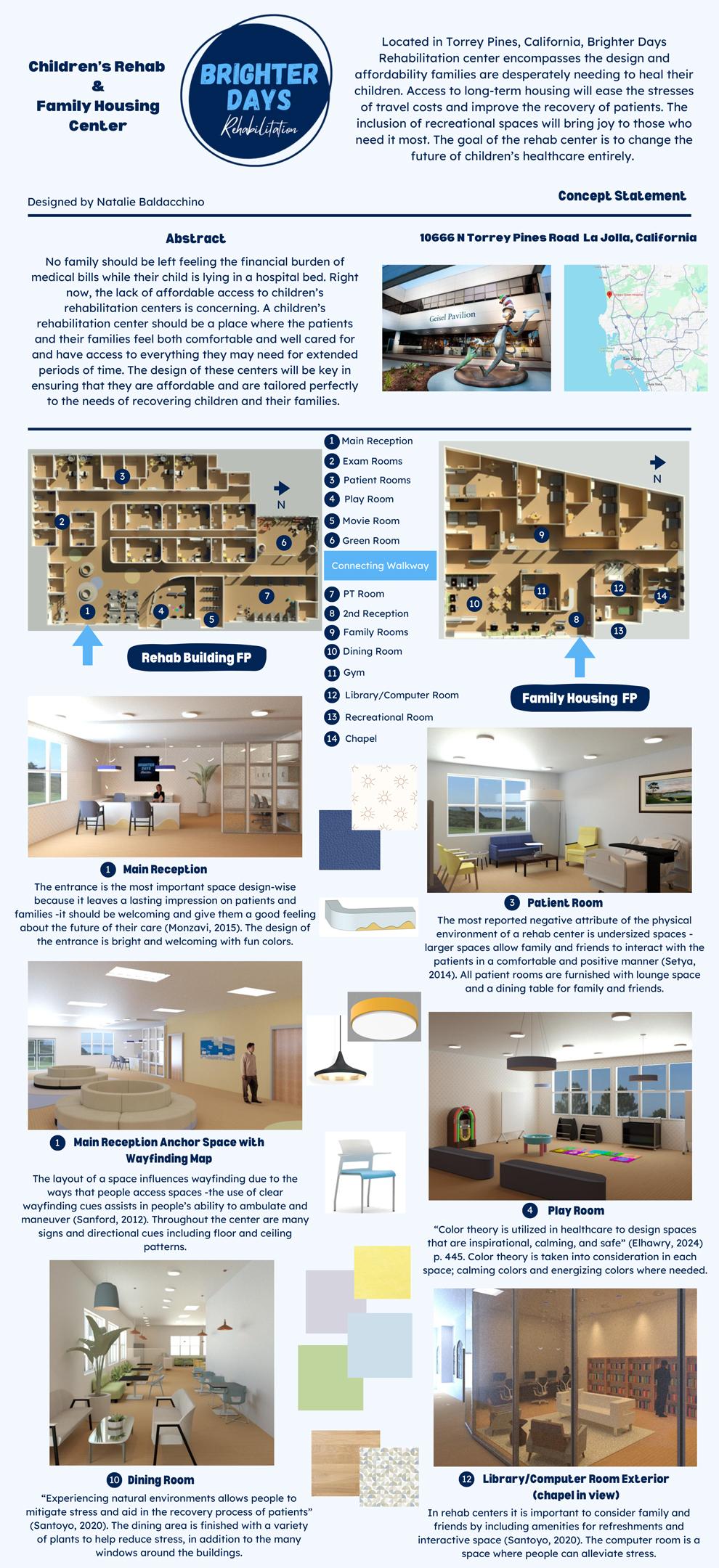 Natalie’s senior thesis focuses on showcasing what should be the future of children’s rehabilitation centers. Her passion for the subject stems from wanting to make a difference in the lives of those struggling with having their child in rehab. The intention of the project is to showcase how design has the ability to assist in the healing of children and provide comfort for their families. Providing access to long-term housing will ease the stresses of travel costs and allow families to be more present for their sick children. The inclusion of recreational spaces will bring joy to those who need it most. The goal of the rehab center is to change the future of children’s healthcare entirely.
