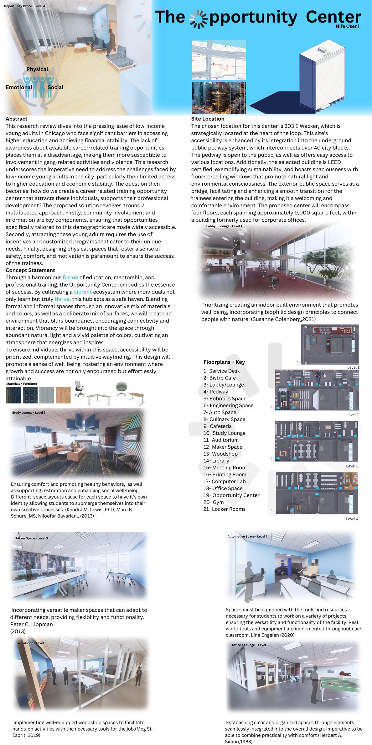 The topic of my thesis project is to create a safe and vibrant learning environment for minorities who otherwise could not afford higher education. A large population of At-risk youth lack the means to attend college or trade school. It is imperative that every person, irrespective of their background, deserves an equal opportunity to succeed and prosper in life. This includes the establishment of programs such as internships, apprenticeships, and mentorships that offer both education and financial compensation. Moreover, an environment that offers life skills courses is crucial. The overarching goal is to empower these individuals to break free from poverty, learn, earn, and grow. Ultimately fostering a safer and more prosperous community. To actualize this belief, the proposed solution is the Opportunity Center- A comprehensive environment that serves as a multifaceted institution, a fusion of university, trade school, mentorship program, and employment hub. The Opportunity Center aims to provide a haven for at-risk youth and those facing financial barriers, fostering their growth, education, and success within a supportive community.