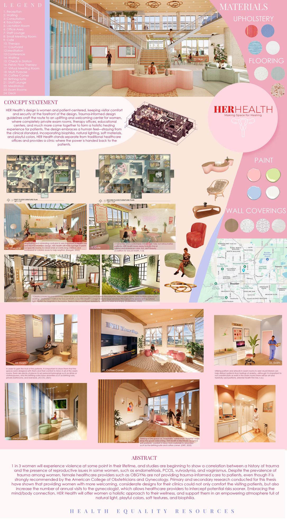 Rachel’s senior thesis is HER Health, “HER” standing for “Health Equality Resources”. After recognizing the need for comprehensive women’s healthcare and the current lack of holistic and trauma-informed care, Rachel created HER Health. HER Health is a women’s health clinic performing on a trauma-informed model of care and emphasizing natural means of healing. When a woman comes to HER Health, she knows she will be listened to and treated with unique consideration, kindness, and empowerment, which is reflected in the design.