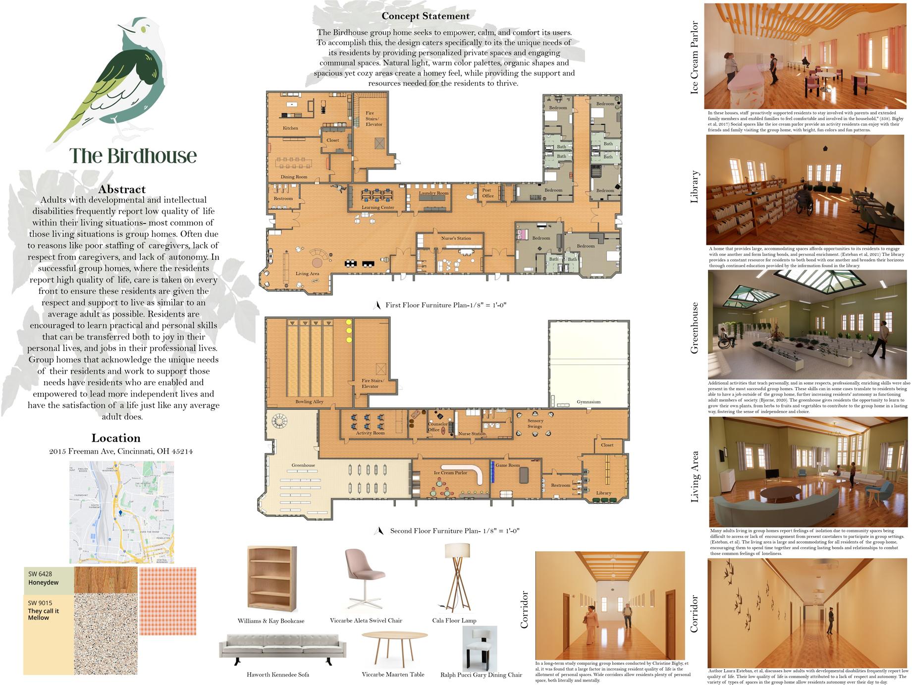I chose to focus my thesis on creating a space for developmentally disabled adults to foster their independence. The group home will empower its residents to grow in their personal and professional lives, providing a safe space for them to reside. It has all the important aspects of care needs and accessibility, combined with the personal comforts of home, providing a sense of community and belonging.