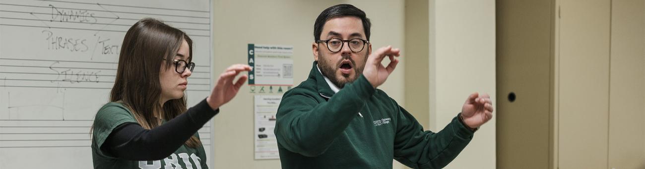 Through Ohio University's minor in conducting, students may further develop their conducting skills so they can become more knowledgeable and marketable in the field. Students gain knowledge that is essential to a conductor, including manual technique, rehearsal skills, score study, repertoire and programming knowledge, ear training and error detection.