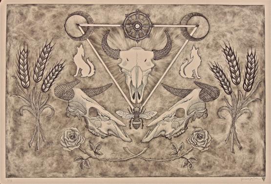 Vanessa Jo Bahr, originally from Chicago, Illinois, graduated from Regis University in Denver, Colorado in 2011 with a Bachelor of Fine Arts degree and a minor in education. She received her teaching licensure in art for K-12 and has worked as an art instructor in schools and art centers in both Colorado and Oregon for the past 12 years. Her primary form of expression is printmaking, mainly linocuts and intaglio carvings but she also works with leather, bone, and wood in other artistic endeavors. The intention of her work is to invoke an appreciation for Earth’s flora and fauna that spans across cultures and transcends time. Her works aims to preserve a reverence for artifacts such as plants, bones, skulls and flowers while exploring the duality of our concept of life and death and to portray them as equally sacred.
