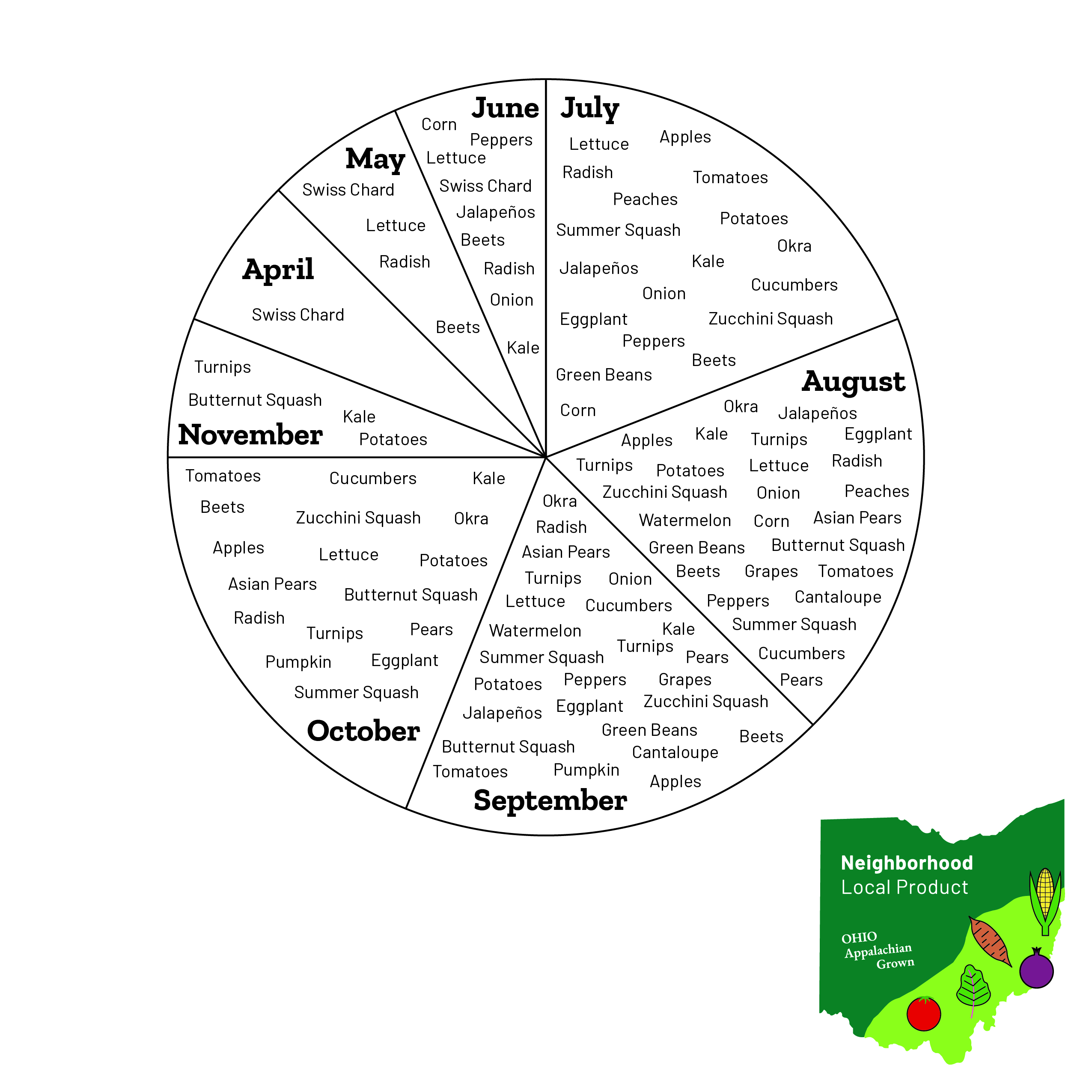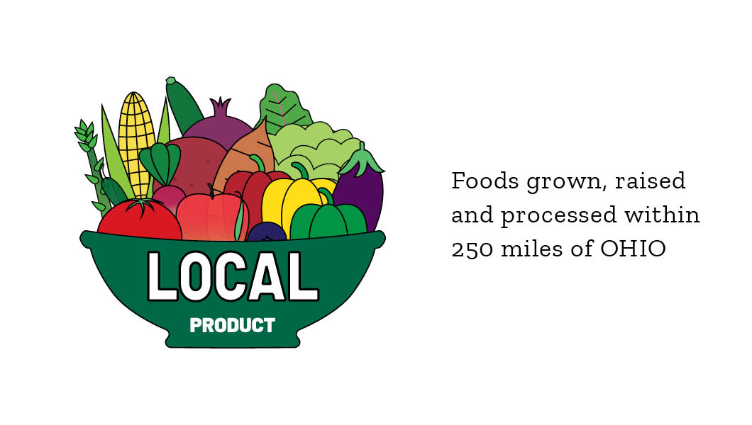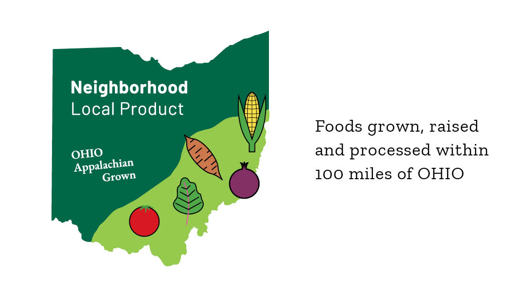 Neighborhood Local Product: Foods that are grown, raised, and processed within 100 miles of Ohio University. Ohio University gives preference to these products to support our region and lower our carbon footprint. Look for this logo in our dining venues: