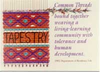 Tapestry was symbolized by a gift of a screen-printed woven tapestry of four colors of thread hung on small dowel rods. "Tapestry is a visual reference of what we want to create. A tapestry is often a careful weaving together of a variety of threads into a particular design or pattern. If it is done well, the individual threads that are used in the making become almost invisible and the overall pattern is what catches the viewer's eye. The threads that are used in a tapestry serve a dual purpose. They are woven together to create a tapestry while at the same time, they bind all of us together in this creative undertaking....Our challenge this year is to commit ourselves to the creation of a tapestry that affirms the dignity and respect of all on campus."