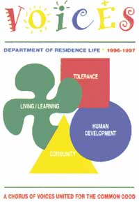 This theme was inspired by the writer Toni Morrison and her unique ability to give "voice" to important ideas and values through her writings. There's a direct connection between Morrison's stories and our work in residence life. The voices of different races, gender, sexual orientation, countries, cultures, experiences, individually tell little stories. On our campus, there are many voices vying for our attention, telling stories. The challenge centers around which voices will we hear and give credence? Decisions and judgments must be made. How do we know which voices to listen to? Which voices will inspire us? Move us? Compel us to act? What shall we give voice to? Through our work we should give voice to hope, compassion, justice, and forgiveness. Principles and values that reflect the department's goals are voices that should be heard. Voices that preach intolerance, hatred, and separation should be shunned.