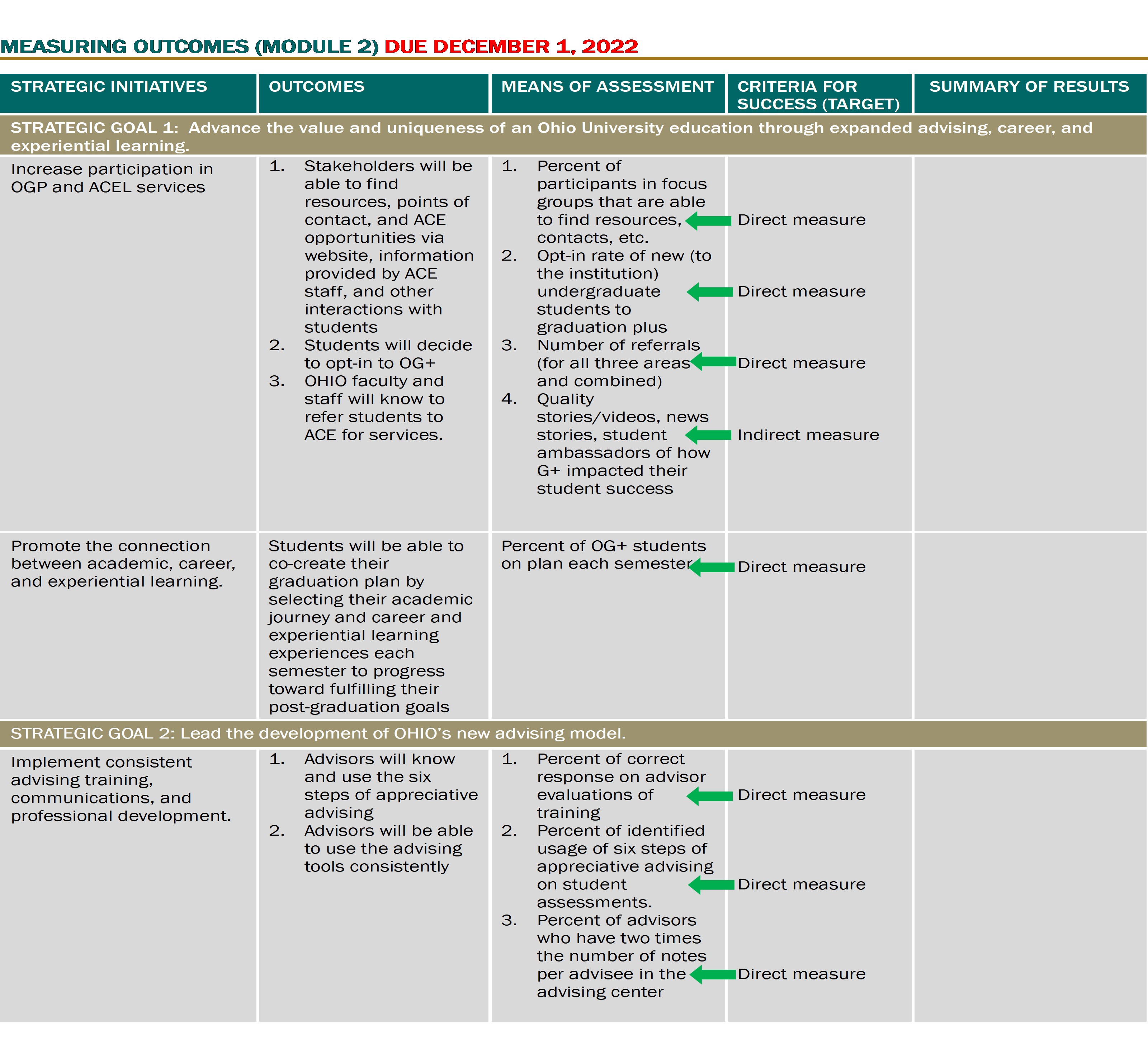 For additional assistance in developing direct measure please contact Joni Wadley, Senior Director for Institutional Effectiveness in Institutional Effectiveness & Analytics (schallej@ohio.edu).