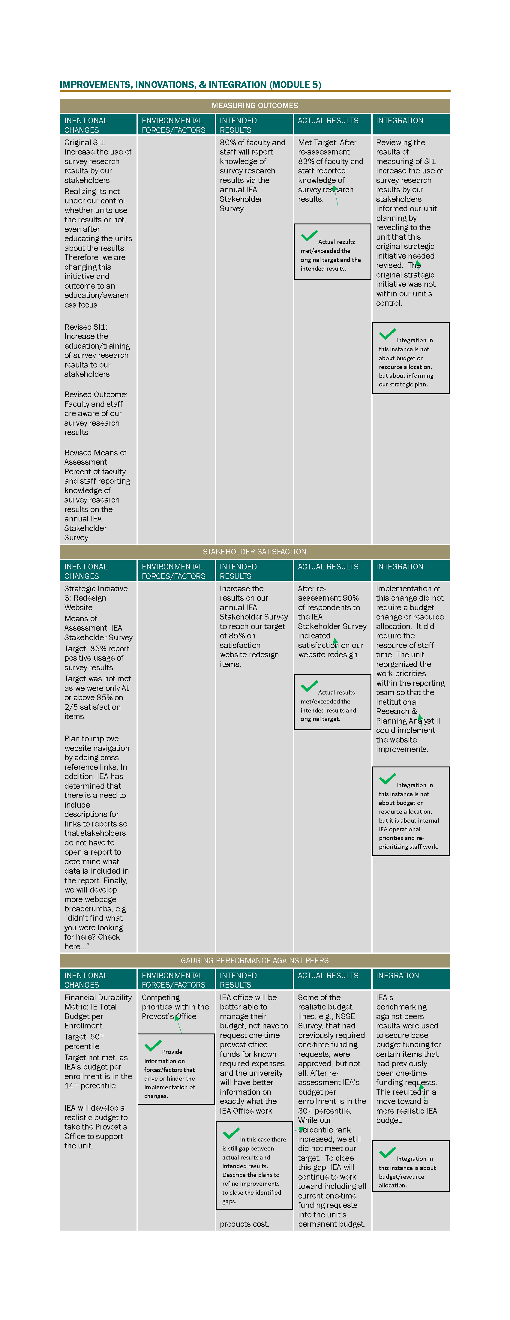 Once the improvements or innovations have been implemented and the units have reassessed and provided another round of their Summary of Results for Modules 2-4, the unit can then proceed with providing responses to the “Actual Results.” It is expected that the unit will provide some explanation as to whether the improvement or innovation was successful by comparing whether the actual results either met or exceeded the intended results or whether there were gaps. If there were gaps identified between intended and actual results, then the unit should describe how the operational improvement strategies will be refined. Under the “Integration” column the unit should describe how the results from evaluating operations resulted in informing unit planning and budgeting/resource allocation.
