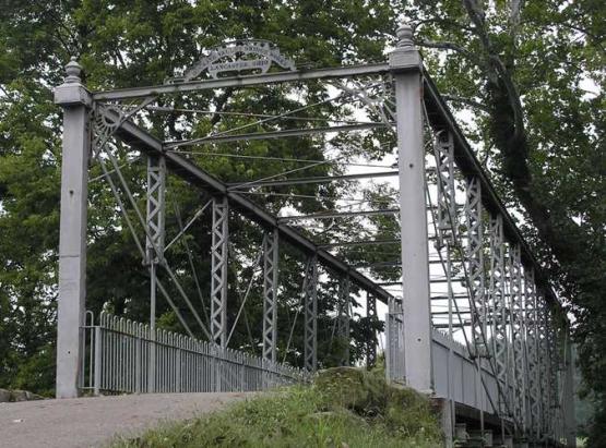 John Bright #1 is very similar in design to its older sibling John Bright #2, although it is an all-metal suspension bridge. Carnegie Steel Company manufactured the steel. Like its covered counterpart, John Bright #1 has an inverted metal arch and Borneman’s trademark metal sway bracing system. But it has an additional feature — a stylized nameplate proclaiming the name of its builder, “Hocking Valley Bridge Works, Lancaster, Ohio.” The county paid Borneman and Hocking Valley Bridge Works a total of $1920, almost twice the cost of John Bright #2, for his all-metal bridge.