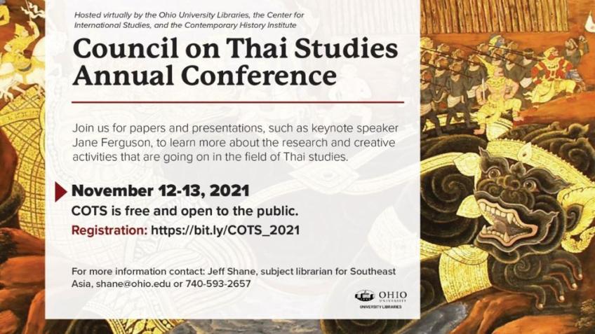 The annual Council on Thai Studies (COTS) conference will be hosted virtually by Ohio University on Nov. 12 and 13 with support from the Center for International Studies, the Contemporary History Institute and Ohio University Libraries. The conference is open to anyone and will include a variety of disciplines related to Thai studies, including language study, anthropology, politics and history. Registration is required for the events.