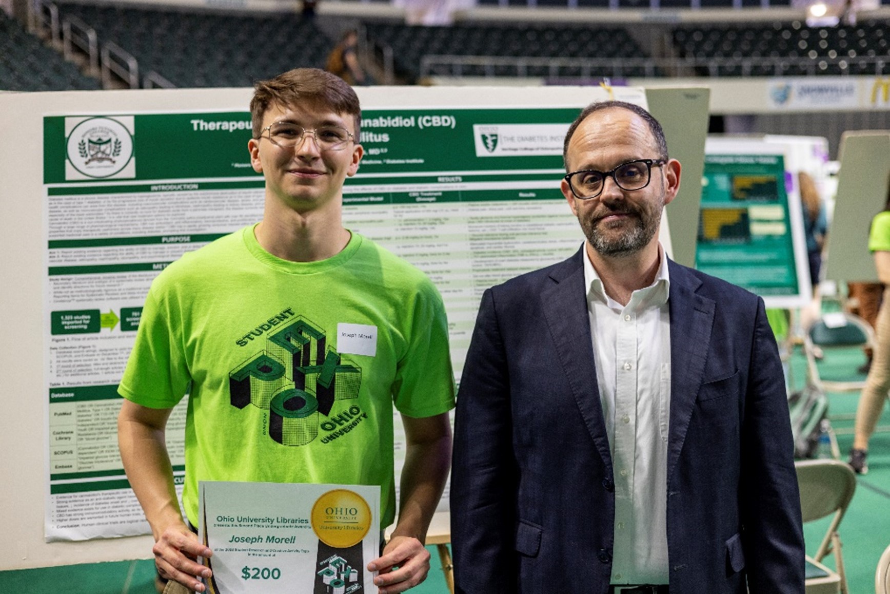 Joseph Morell, a senior studying transitional health, poses with Neil Romanosky, dean of University Libraries, for a photo in front of Morell’s trifold of work. Morell won the second-place undergraduate award presented by Ohio University Libraries for the project, “Therapeutic Effects of Cannabidoil in Diabetes Mellitus.” His work focuses on cannabidiol in relation to diabetes.