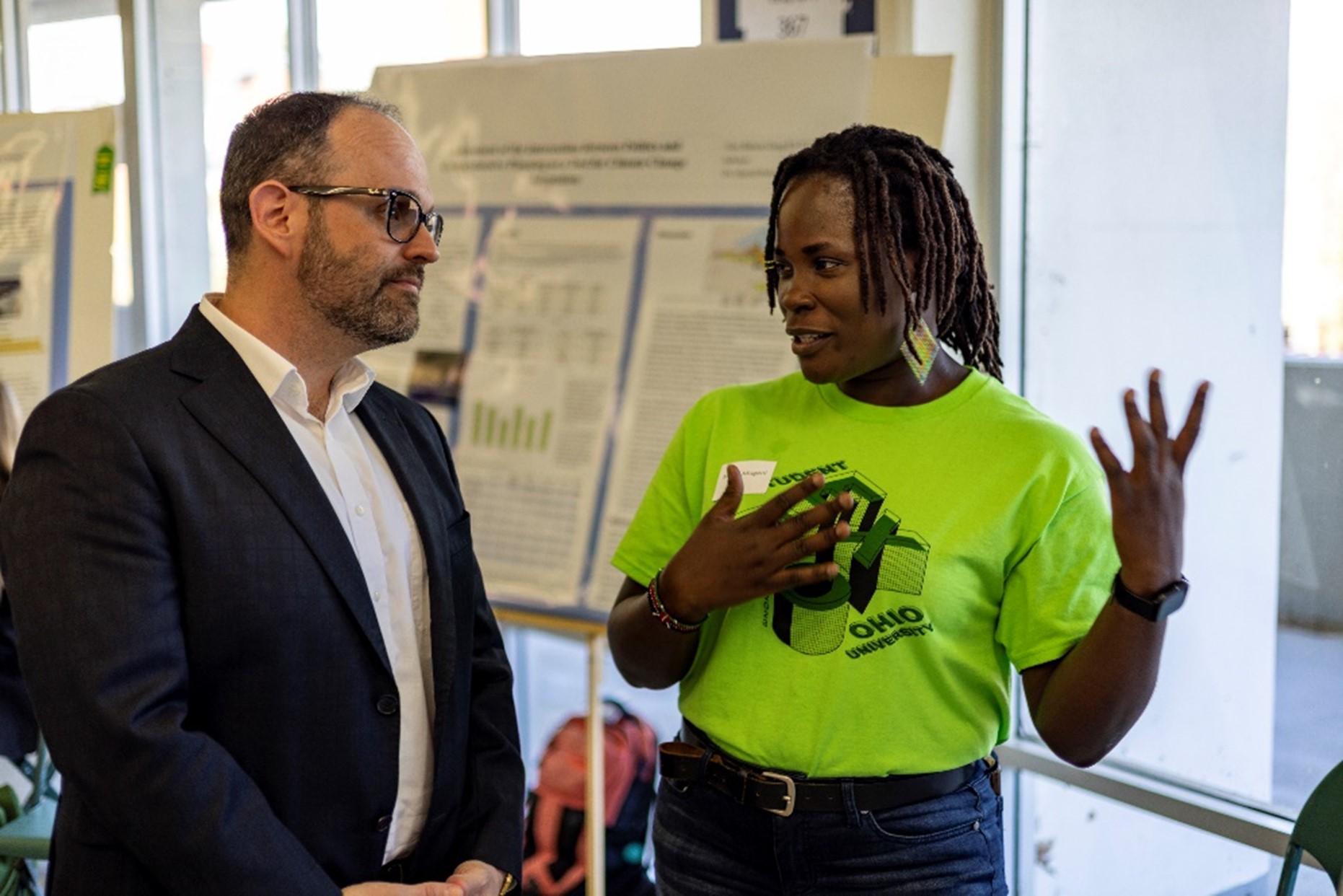 Maria Mugeni, a graduate student working toward a master’s in geography, presents to Neil Romanosky, the dean of University Libraries. Mugeni was the recipient of the Libraries’ first-place graduate award for her project on the impact of floods entitled, “A gendered perspective on climate change and flood risks in urban informal spaces; Kibera informal settlement, Nairobi, Kenya.”