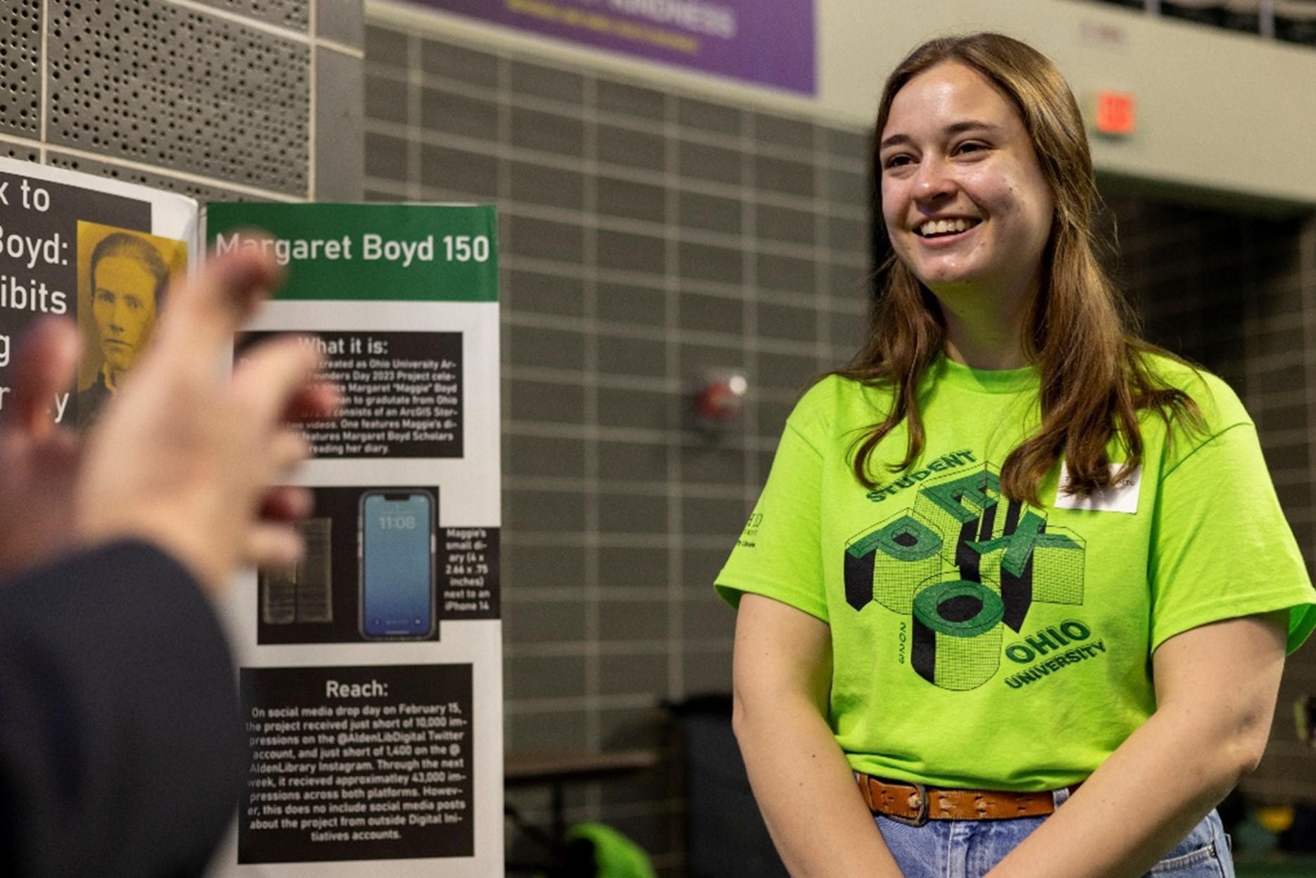 Taylor Burnette, a senior studying journalism, presents her project “From Styx to Margaret Boyd: Digital Exhibits utilizing Ohio University Archives” at the 2023 Student Expo on Thursday, April 13. Burnette won the second-place Libraries Connection Award presented by Ohio University Libraries for her project on historic archives and educational digital exhibits.