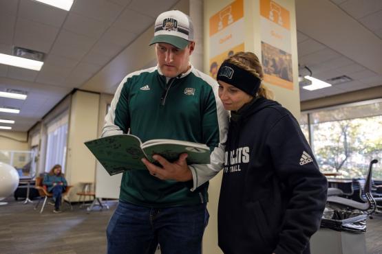 Jordan Thompson, OHIO class of 2012 with a bachelor’s in engineering technology management, and Ashley Thompson, spouse of Jordan Thompson, browse through University Archives’ publications at the Libraries’ Homecoming display held at Alden Library. Jordan Thompson had many late nights studying at Alden Library when he was an undergraduate at OHIO.