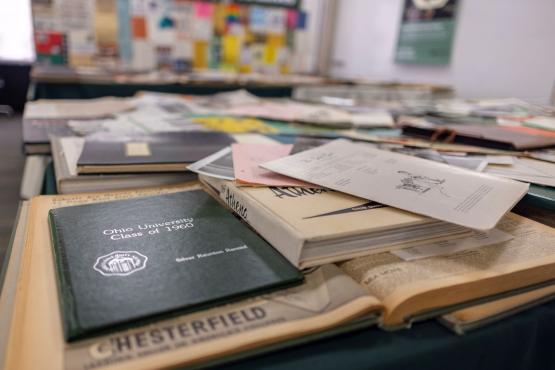 A wide variety of Ohio University Archives’ memorabilia such as yearbooks, photos and publications were on display during University Libraries’ Homecoming event held at Alden Library. The in-person display was titled, “Lasting Memories: Your Annual OHIO Homecoming Display,” and showcased the long and rich history of both OHIO and University Libraries.