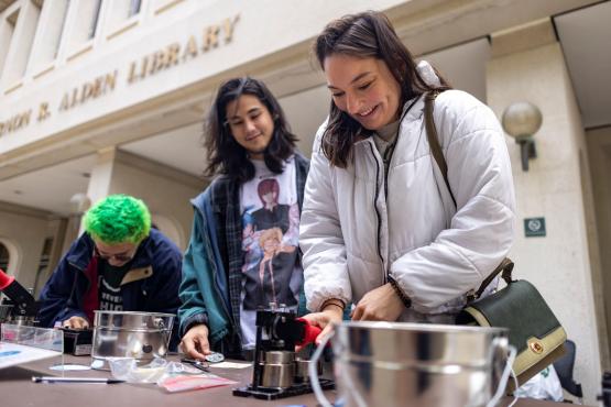 Kyle Shepherd, OHIO class of 2021 with a bachelor’s in philosophy pre-law, and Megan Urdiales, OHIO class of 2022 with a master’s in clinical exercise physiology, spent time at the button-making station outside of Alden’s fourth floor. Shepherd and Urdiales came back to the Libraries to visit the place where Urdiales spent a lot of her time as both an undergraduate and graduate student.