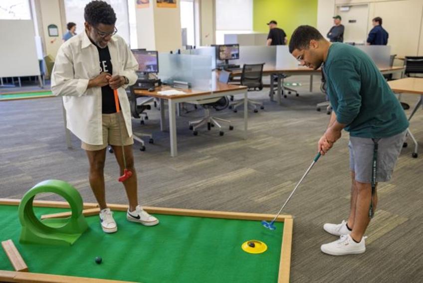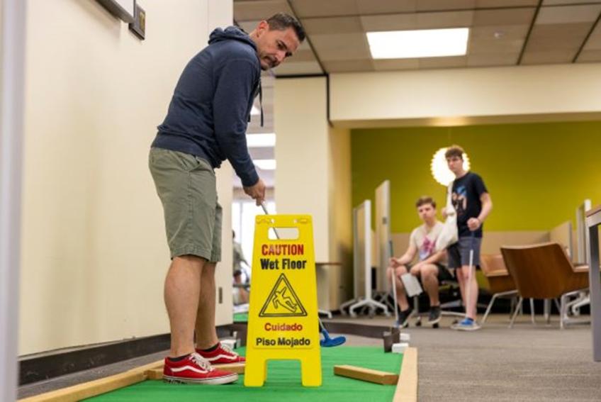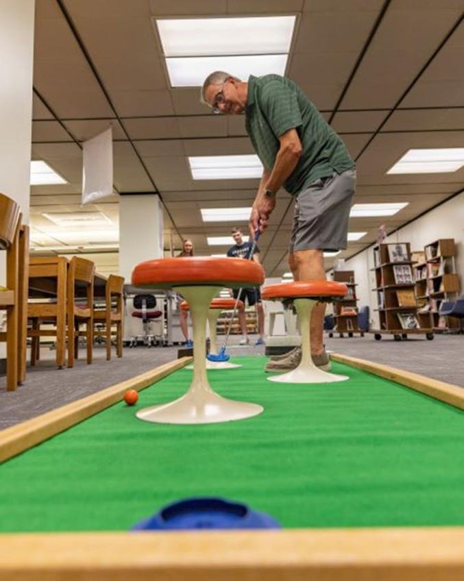 University Libraries held their ever-popular Alden Open during Dads Weekend on Saturday, Nov. 5, 2022 from 10 a.m. to 4 p.m. The annual mini-golf course is a popular activity for students and fathers with its 18 holes and three floors of fun in Alden Library. Games such as cornhole and Giant Jenga were available to play too. The Open was free of charge as well as open to everyone.