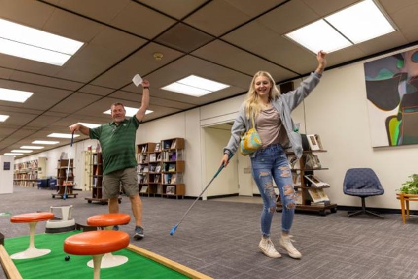 Students and dads alike enjoy mini golf with University Libraries during Dads Weekend