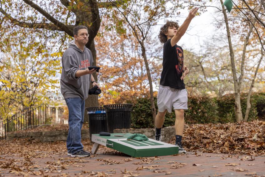 Spencer Hunt plays cornhole with his son, Donovan Hunt, a sophomore, outside the fourth floor of Alden Library. In addition to mini-golf, activities such as cornhole and Giant Jenga were available to play as well.
