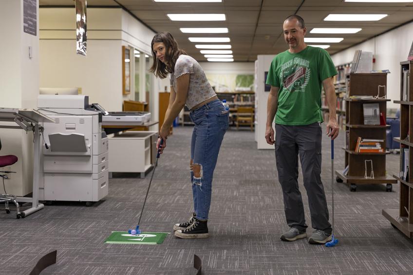Jeff Brooks, watches his son, Tyler Brooks, a sophomore studying aviation, complete a putt on the fourth-floor course in Alden Library. The themes and courses change every year, so it’s always a surprise for those new and returning to play.