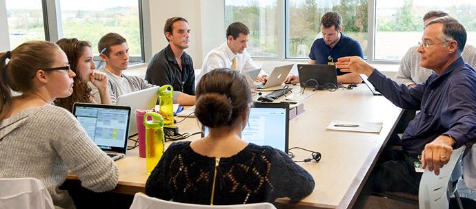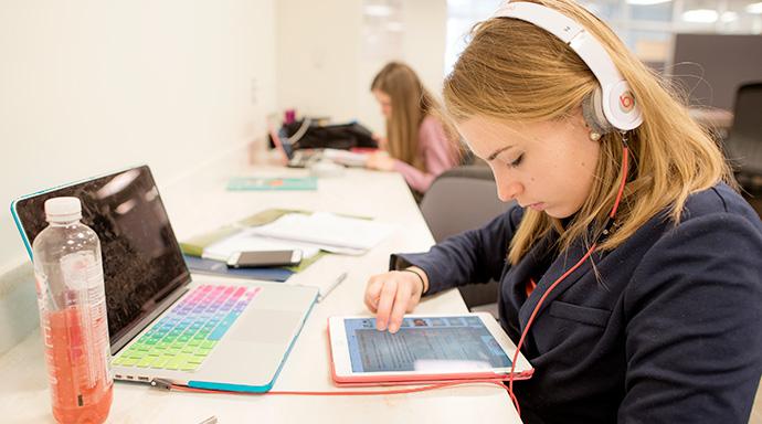The Learning Labs are the main lecture spaces for students. The interactive “pods” allow students in Dublin to connect with those on the Athens campus and Cleveland. Students and instructors use connection ports to synchronize content on their notebooks and tables, and share questions and course material on the central displays. Learning Labs are located on the 3rd and 4th floors.