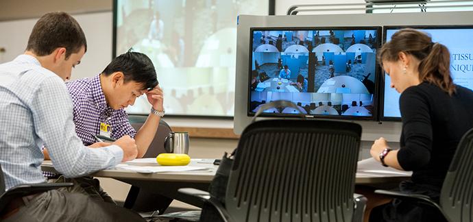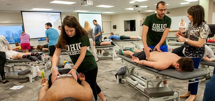 tables in the lab. Aided by large-screen video displays that connect the OMM lab to counterpart labs, peers and instruction examples shared on the Athens and Cleveland campuses.