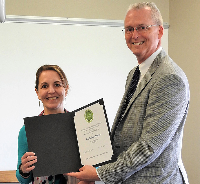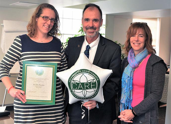 Murphy also is an accomplished researcher who provides valuable input to others within the Department of Biomedical Sciences and throughout the college. “I’ve had the pleasure of seeing first-hand what a collaborative, engaged and thorough research Erin is,” said another nominator. “She is the type of faculty member who is extremely valuable but likely doesn’t get the recognition she deserves. She is an ideal citizen to the students, the department and to the university.”