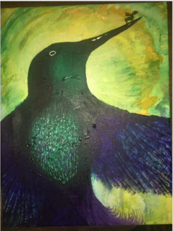 A painting of a gigantic humming bird in flight balancing a miniature moose on the tip of its beak, symbolizing that no matter how small you may feel, you can accomplish anything you put your heart, mind and soul into.