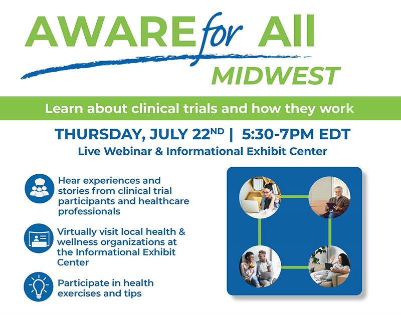 The Clinical & Translational Research Unit participated in an online webinar and information exhibit to educate the public, medical and research communities about clinical trials. The Center for Information and Study on Clinical Research Participation AWARE for All Midwest event was held on July 22. If you were unable to attend, you can still access the webinar recording and informational exhibit center here and the program handbook here.