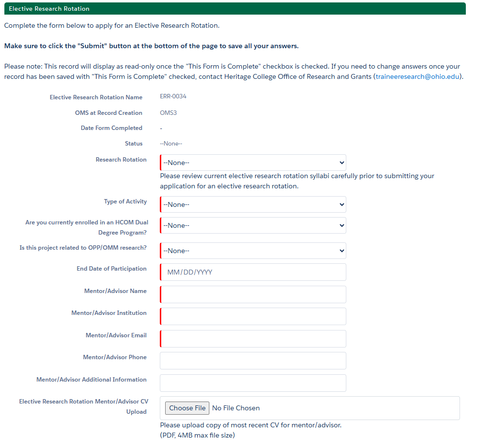 When you reach the bottom of the form, you can save the form without completing it. To do this, please click “Submit” without selecting the box indication “This Form is Complete.” Once the “This Form is Complete” box is selected and the form is submitted, the form will be read only. Please be sure to review the record to ensure it is accurate and complete before selecting the “This Form is Complete” box. If you need to make edits to a read only record, please contact traineeresearch@ohio.edu with the elective research rotation application number and request that the form be re-opened for editing. Once edits are completed, you will again need to submit the record as complete. The Elective Research Rotation Application will not be placed into the ORG review queue until this form has been marked complete and submitted.